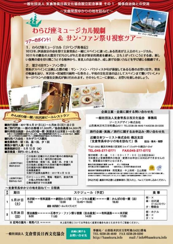 支倉常長ゆかりの地を訪ねてと題し、関係自治体との交流を図った今回のツアーは、秋田県のわらび座にて上演される支倉常長とともにスペインにわたった若者が主人公のミュージカルと宮城県石巻市で開かれる「石巻サン・ファン祭り」の視察がメインでした。